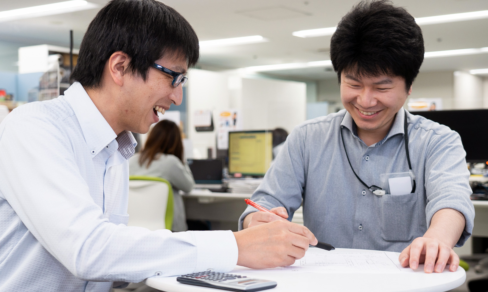 設計業務は基本的にパソコンに向かうことが多いですが、近くにメンバーがいるので、分からないことがあればすぐに相談できます。雑談や冗談を交わすこともあり、リラックスして働ける環境です。それぞれが自分のペースを大切にしながらも、お互いに切磋琢磨し、共に成長していける職場だと感じています。